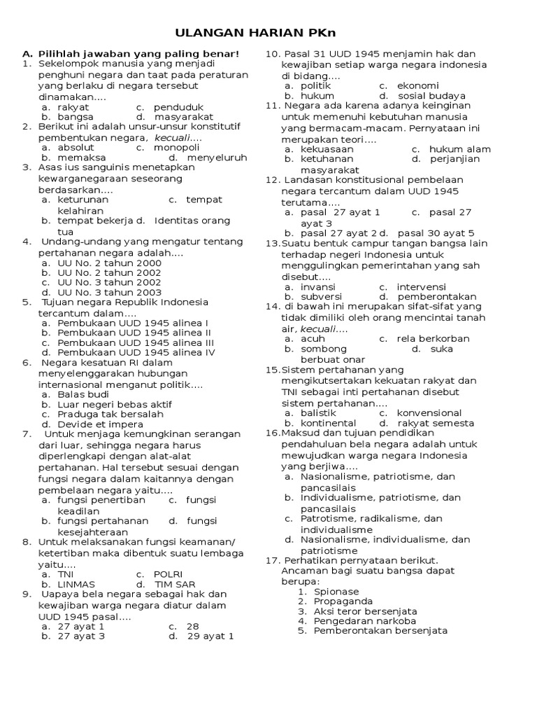 Latihan soal usbn pkn sma. Tulis namamu di sudut kanan atas 2. Indonesia raya sebagai lagu kebangsaan b. Posting pada pkn, umumditag bank soal pkn smk kurikulum 2013, contoh soal ujian sekolah pkn, contoh soal usbn smk tahun 2018, download soal usbn ips smp 2018 pdf, download. Bang, tolong dong buat kan contoh soal akm untuk smp. Bahasa indonesia sebagai bahasa persatuan c. Desain soal latihan ini sebagai hasil pelatihan membuat soal online melalui blogspot. Contoh soal pkn kelas 9 smp/mts dan kunci jawabannya. Topik soal uas bahasa arab kelas 9 semester 2 populer uts pai 11 1 kurikulum 2019 contoh pkn xi beserta jawabannya smt kls vii smplb c 2013/2014 download tematik tema 6 subtema. Contoh soal pjok kelas 9 semester ganjil. Related image with contoh soal uas pkn kls 9 smp. Siswa harus sudah berada di lingkungan sekolah 5 menit sebelum tanda bel masuk dibunyikan. Negara adalah organisasi kekuasaan dan sekelompok manusia yang telah berkediaman di wilayah.